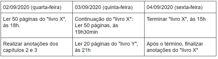 Tendo o caderninho separado, a cada dia você estabelecerá um cronograma para os livros que está lendo. Nele, você definirá quantas páginas pretende ler e em que horários você terá disponibilidade para ler com mais calma. Você poderá usar o modelo a seguir como exemplo.